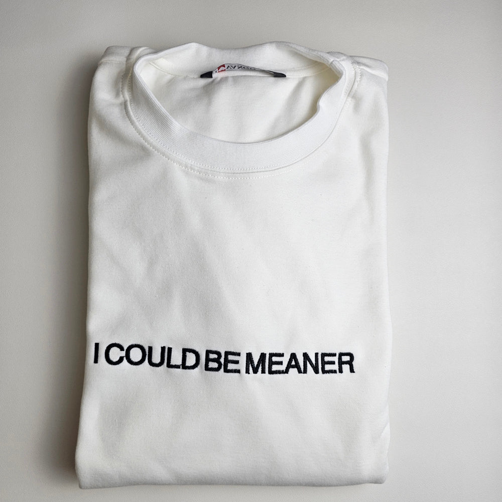 Some people call it being nice, but let’s be honest—you’re just holding back! This "I Could Be Meaner" Embroidered Sweatshirt is perfect for anyone with a spicy attitude and a sharp sense of humor. Made with premium embroidery on a cozy crewneck, this sweater is ideal for those who keep their sass in check but love to let it show. Whether you're the funny parent, the mean-yet-loving friend, or just someone who knows they could be worse, this sweatshirt is a must-have. It also makes a hilarious gift for friends, siblings, or anyone who’s just a little too nice for their own good!