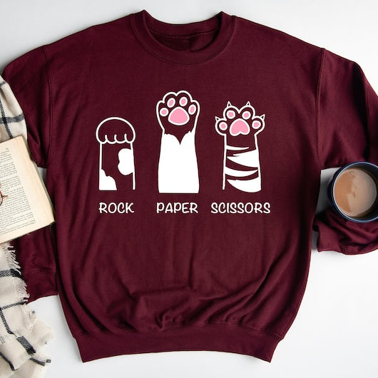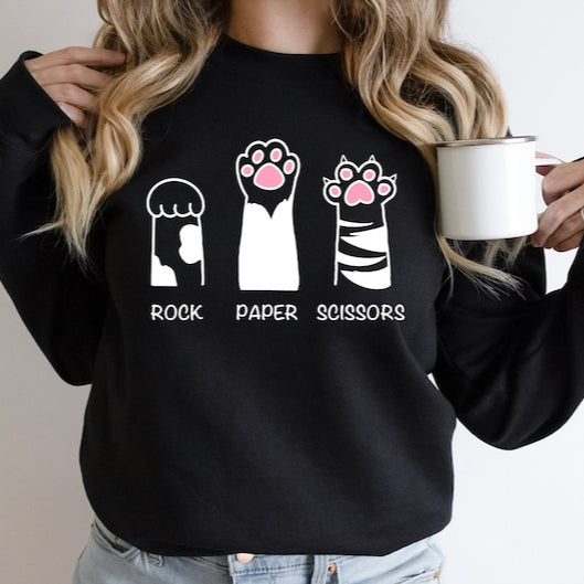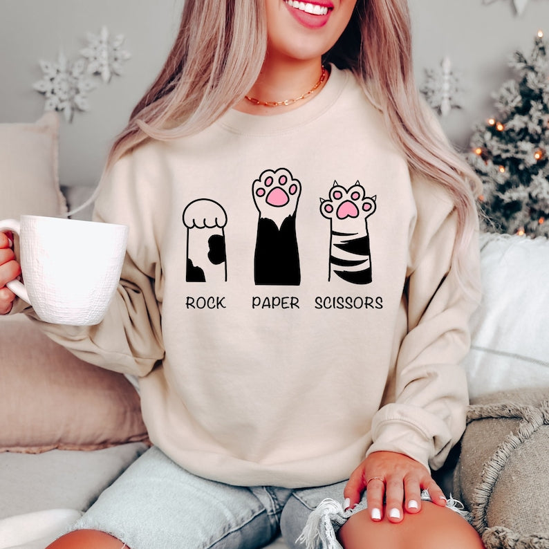 Embrace comfort and charm with this Rock Paper Scissors Cat Printed Sweatshirt. Crafted from soft, cozy fabric, it delivers warmth for everyday wear while showcasing an adorable cat-themed design that adds a playful touch to your casual wardrobe. Ideal for those who appreciate unique, comfy clothing that stands out with subtle creativity.